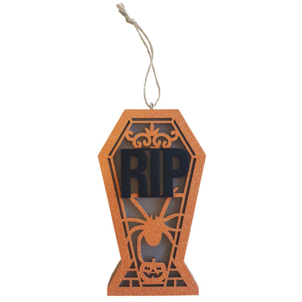 Κρεμαστό ξύλινο διακοσμητικό φέρετρο RIP 15x9x4εκ. με φως που αλλάζει χρώμα για διακόσμηση Halloween. Οι μπαταρίες περιλαμβάνονται.