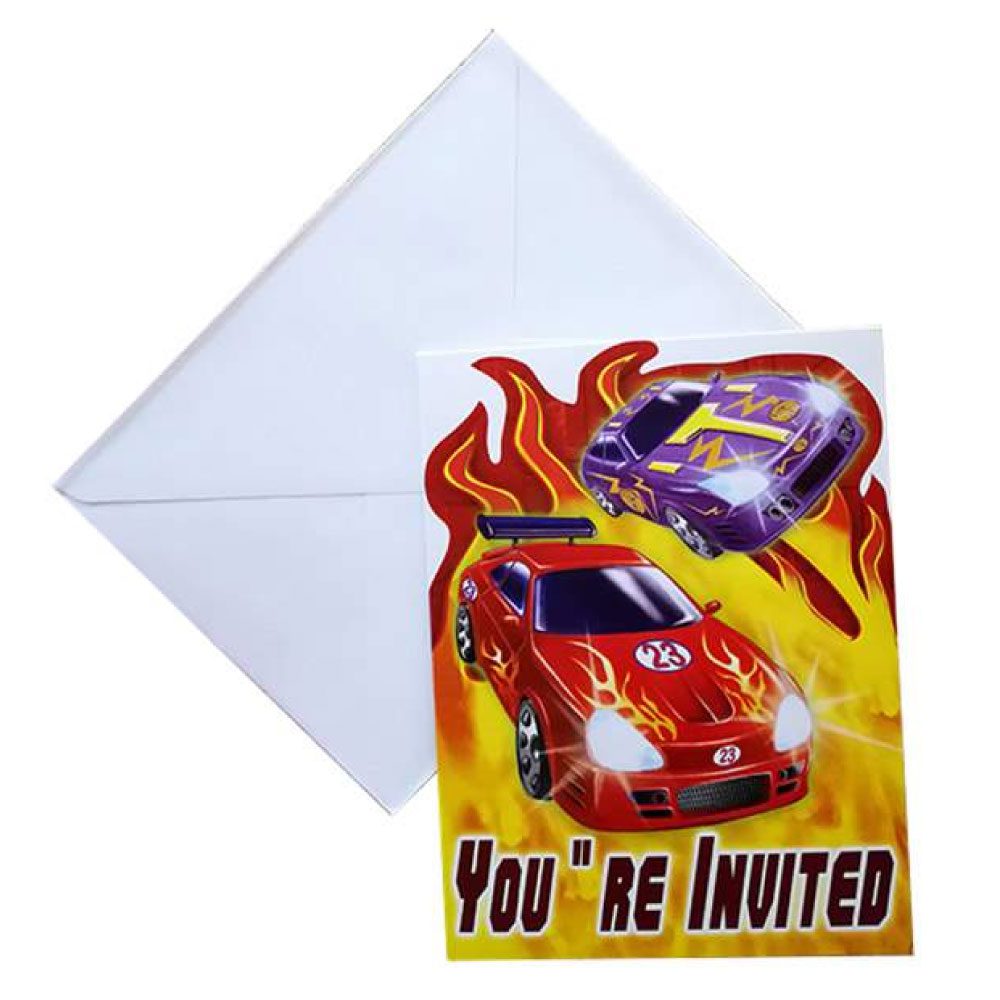 Προσκλητήρια για το πάρτυ γενεθλίων Rally Cars. Από σκληρό χαρτόνι, με λευκό φάκελο. Σετ 8 τεμαχίων.