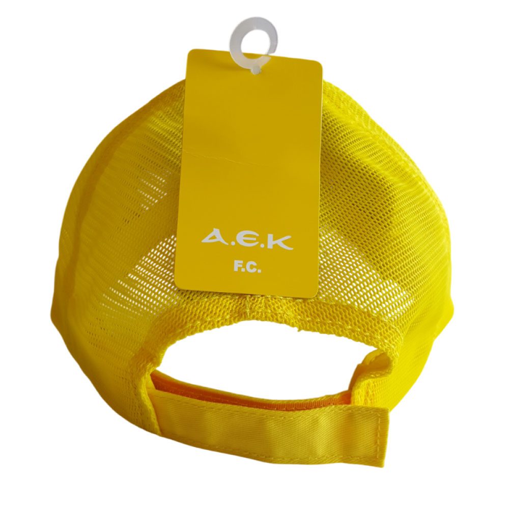 Καπέλο κιτρινόμαυρο με τα αρχικά της ΑΕΚ. Μαύρο μπροστά, κίτρινο δίχτυ στο πίσω μέρος.