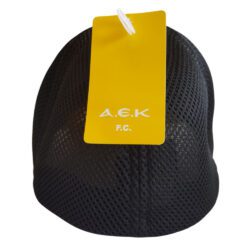 Καπέλο μαύρο με κίτρινη ρίγα και το σήμα της ΑΕΚ FC. Μαύρο δίχτυ στο πίσω μέρος.