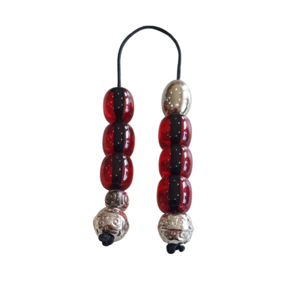Μπεγλέρι με 6 κόκκινες χάντρες και 4 διακοσμητικές περασμένες σε μαύρο κορδόνι. Το μπεγλέρι είναι 13εκ. μήκος κι έρχεται σε κουτί.