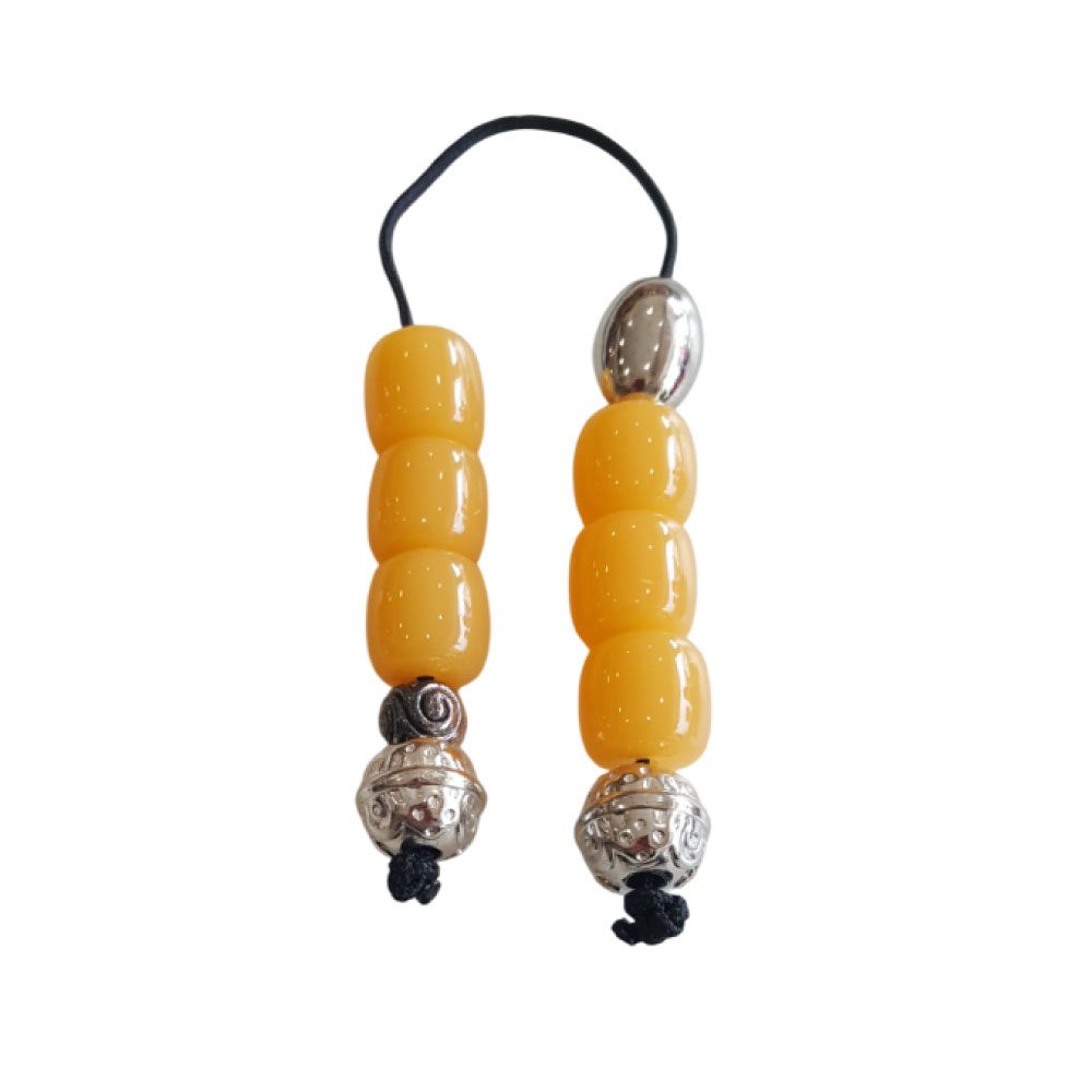 Μπεγλέρι με 6 μπεζ χάντρες και 4 διακοσμητικές περασμένες σε μαύρο κορδόνι. Το μπεγλέρι είναι 13εκ. μήκος κι έρχεται σε κουτί.