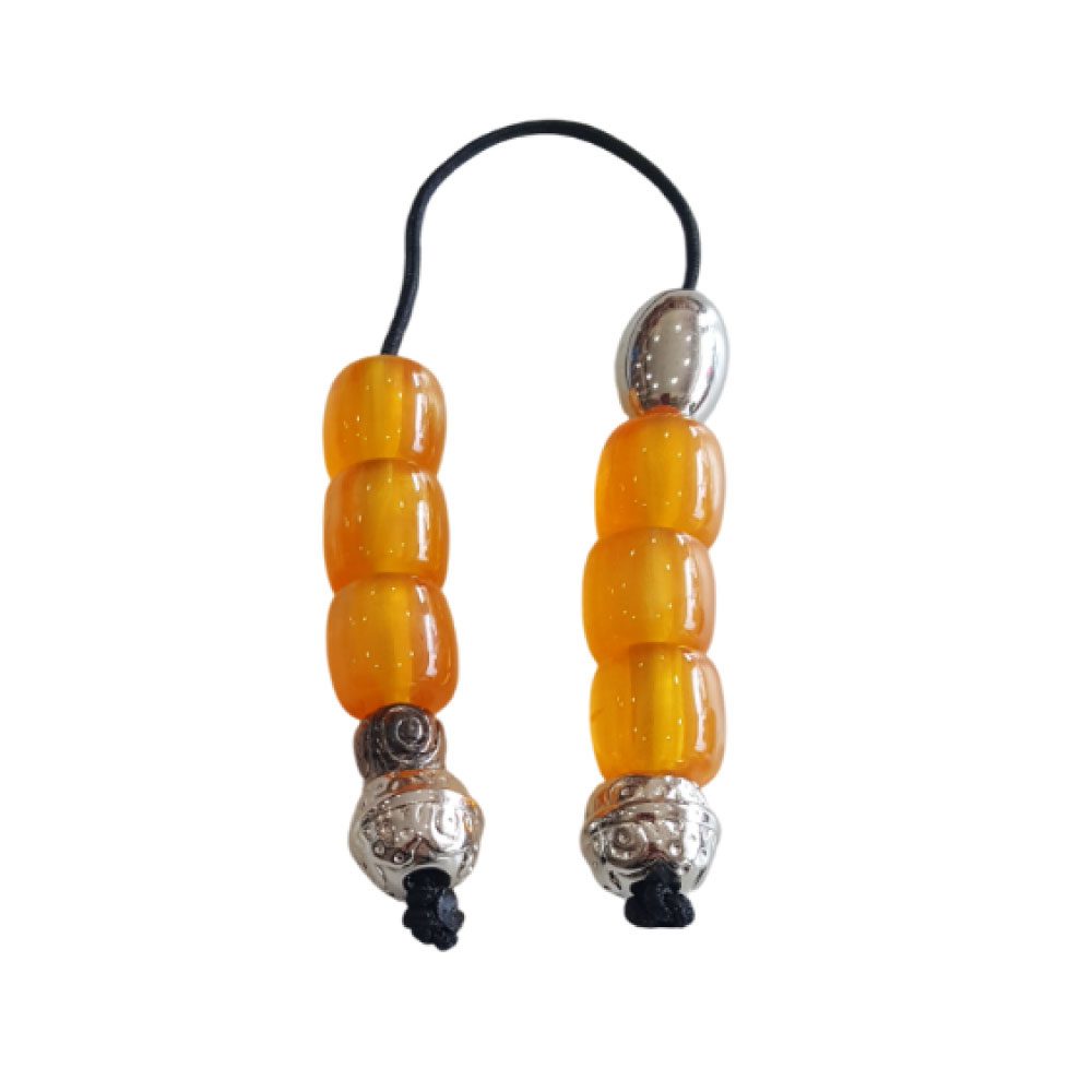 Μπεγλέρι με 6 χρυσές χάντρες και 4 διακοσμητικές περασμένες σε μαύρο κορδόνι. Το μπεγλέρι είναι 13εκ. μήκος κι έρχεται σε κουτί.
