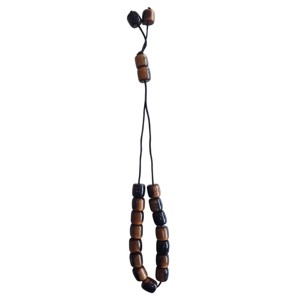 Κομπολόι με 19 δίχρωμες (καφέ μαύρες) χάντρες 1,5εκ. περασμένες σε μαύρο κορδόνι. Το κομπολόι είναι 30εκ. μήκος κι έρχεται σε κουτί.