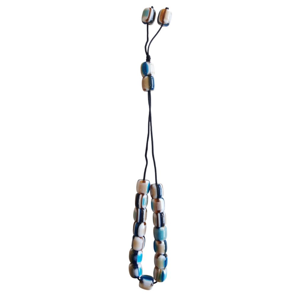 Κομπολόι με 19 πολύχρωμες (μπλε) χάντρες 1,5εκ. περασμένες σε μαύρο κορδόνι. Το κομπολόι είναι 30εκ. μήκος κι έρχεται σε κουτί.