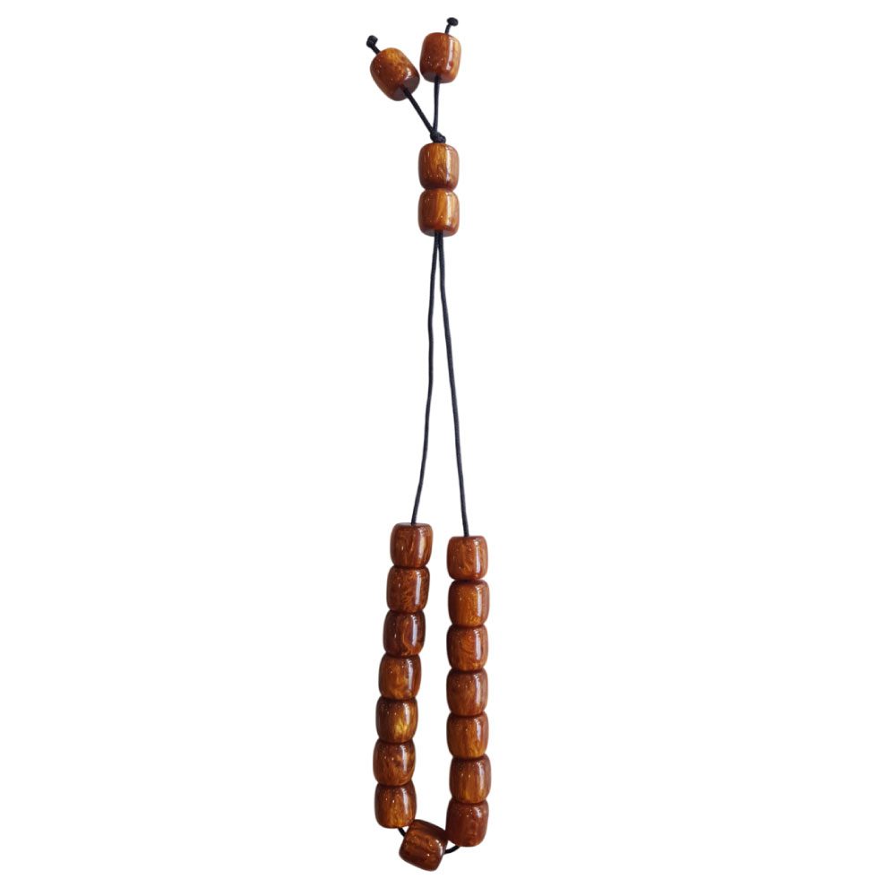 Κομπολόι με 19 τύπου ξύλου χάντρες 1,5εκ. περασμένες σε μαύρο κορδόνι. Το κομπολόι είναι 30εκ. μήκος κι έρχεται σε κουτί.