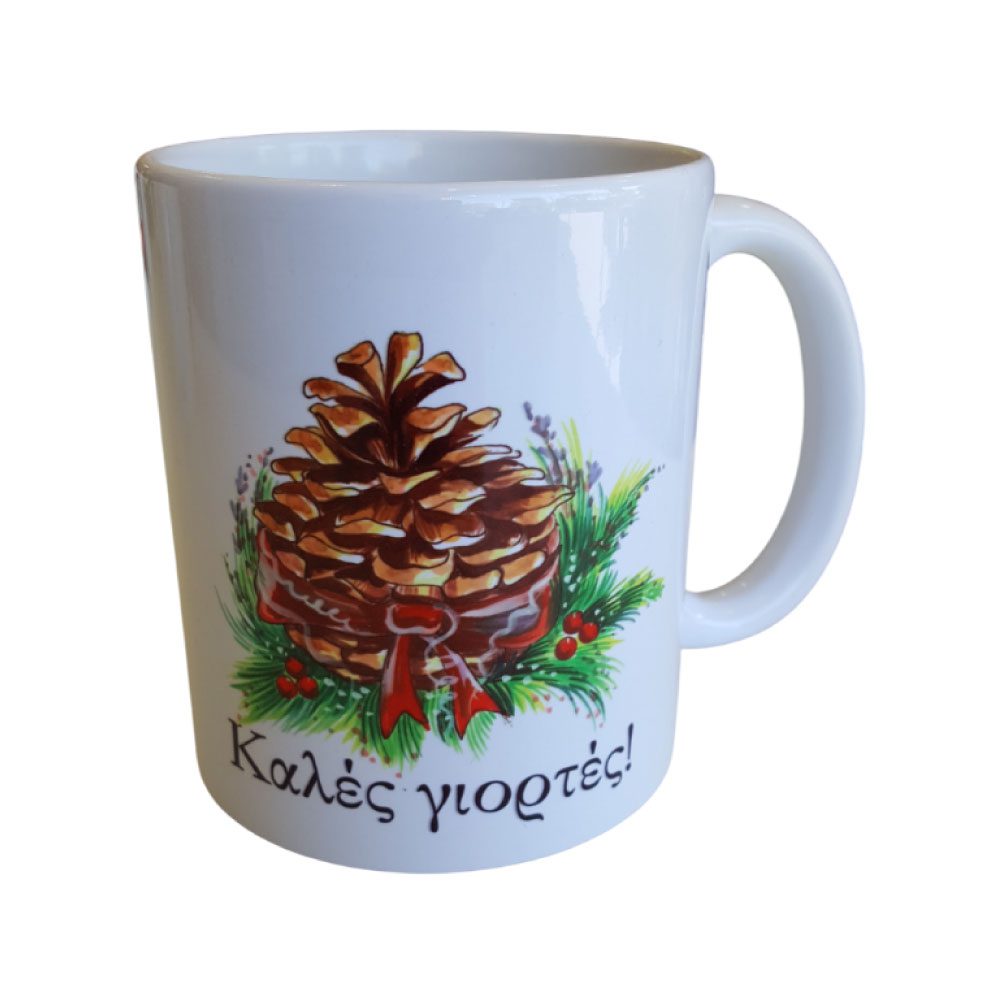 Κούπα πορσελάνης για τις γιορτές των Χριστουγέννων με μήνυμα "Καλές Γιορτές" και κουκουνάρα.