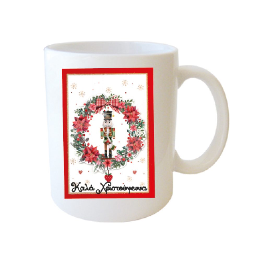 Κούπα πορσελάνης για τις γιορτές των Χριστουγέννων με μήνυμα "Καλά Χριστούγεννα" με στρατιωτάκι μέσα σε στεφάνι και κόκκινο πλαίσιο.
