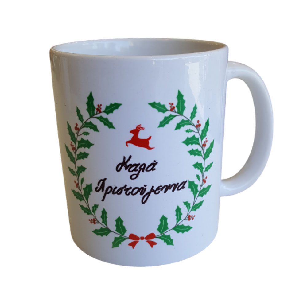 Κούπα πορσελάνης για τις γιορτές των Χριστουγέννων με μήνυμα "Καλά Χριστούγεννα" και λεπτό στεφάνι με τάρανδο.