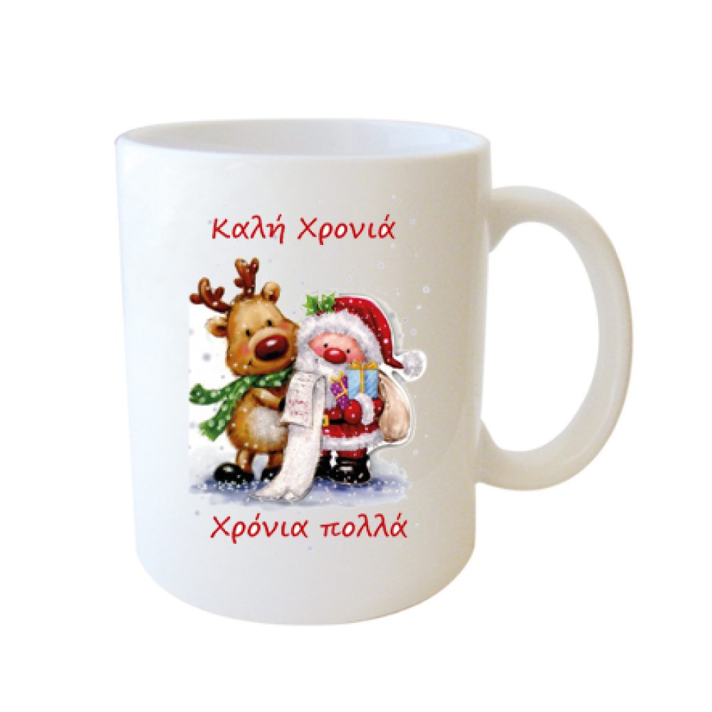Κούπα πορσελάνης για τις γιορτές των Χριστουγέννων με μήνυμα "Καλή Χρονιά, Χρόνια Πολλά" και με τάρανδο και Άγ.Βασίλη να τσεκάρουν τη λίστα του.