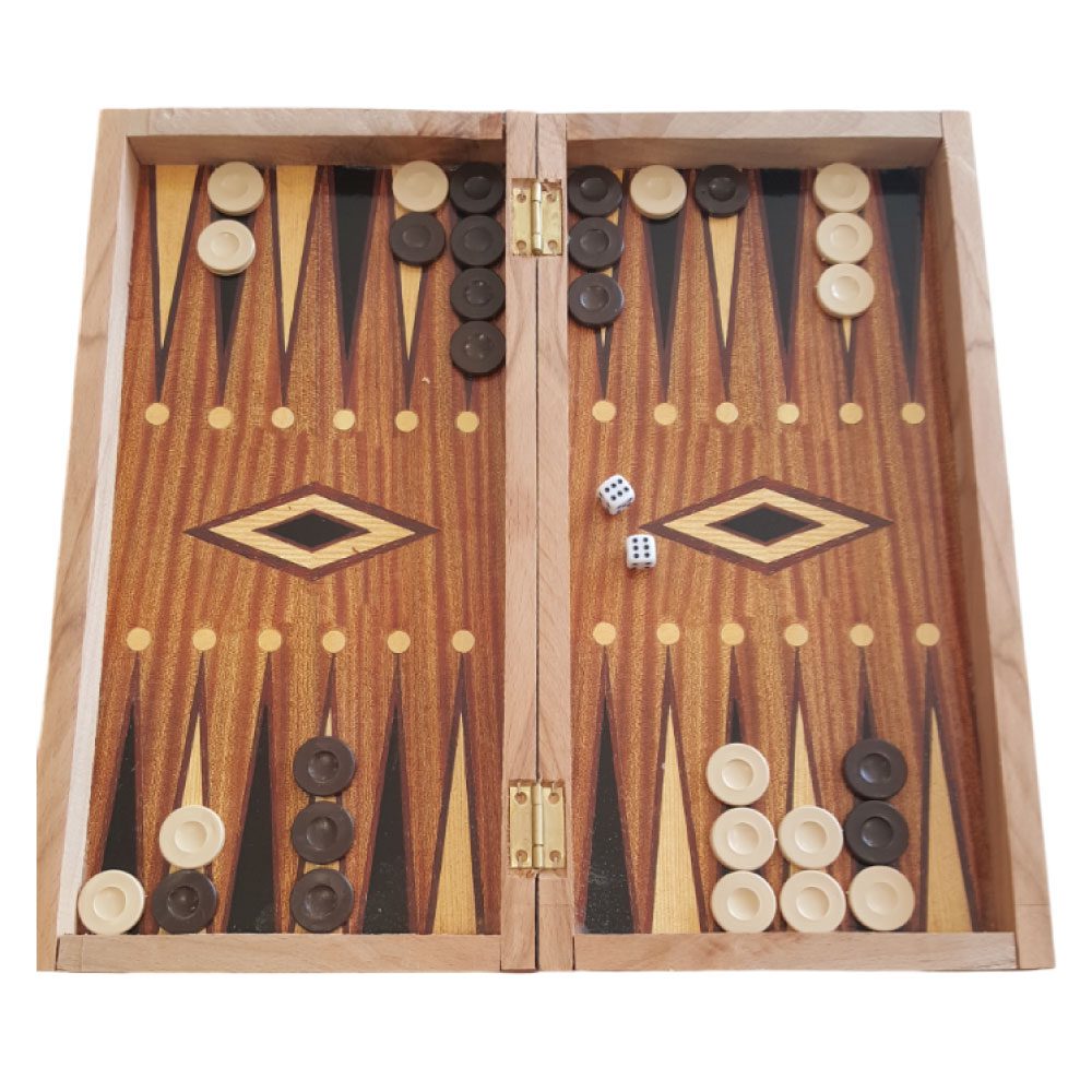 Ξύλινο τάβλι 30εκ. με 15 καφέ και 15 μπεζ πλαστικά πούλια 2εκ. Περιλαμβάνονται δυο ζάρια του 1εκ.