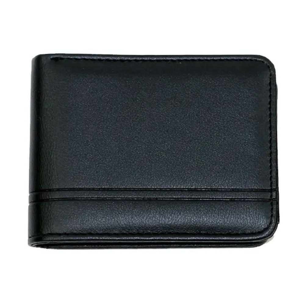 Πορτοφόλι ανδρικό από δερματίνη 10,8x8,8εκ. σε μαύρο χρώμα με θήκες για κάρτες, χαρτονομίσματα και κέρματα.