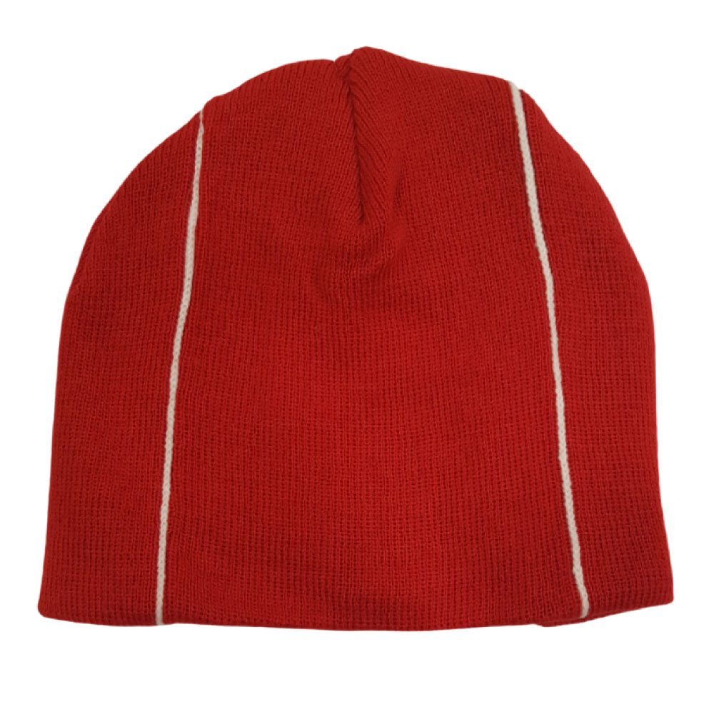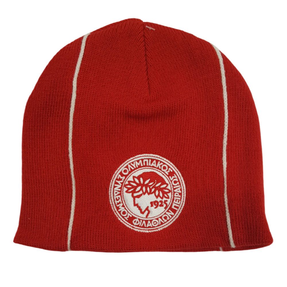 Πλεκτός σκούφος κόκκινος με κεντητό το σήμα του Ολυμπιακού στο μπροστινό μέρος και δυο λευκές ρίγες. One size.